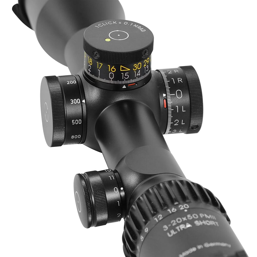The 3-20x50 PM II Ultra Short from Schmidt & Bender is the ideal scope for short rifles. While it's only 13.6 inches in length, it still packs several of the features the full size 3-20x50 PM II does. The ultra compact elevation turret is designed as a double turn with 3.5 m/100 m adjustment range. The red dot sight that is installed on the back of the mounting ring will bridge close distances that you may encounter. Targets are now easier to identify thanks to the precise parallax adjustment and large field of view. Similar to other scopes for sniper use, the 3-20x50 PM II Ultra Short features an MTC setting and can be locked in place. The side turret has a cap to prevent unintentional adjustment.