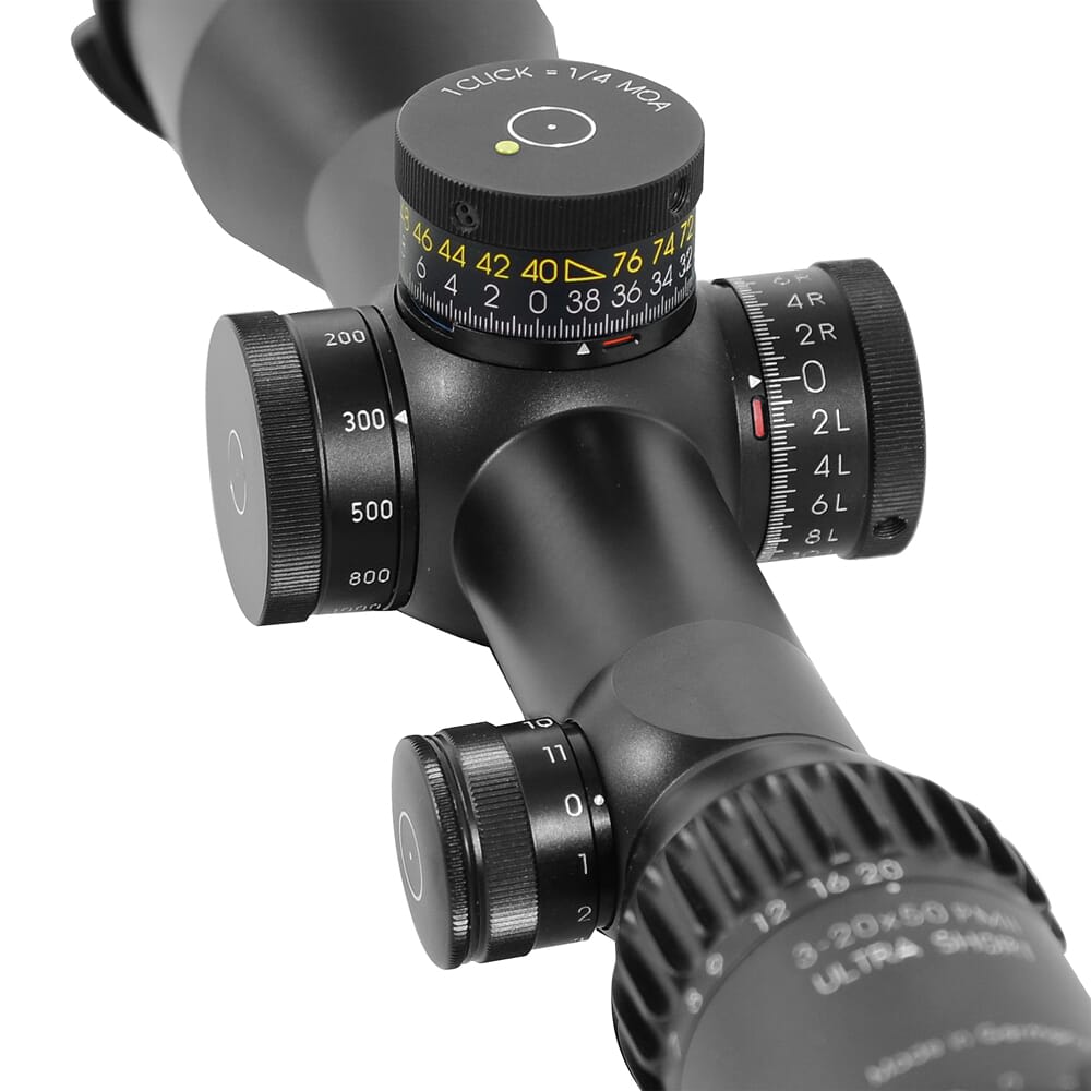 The 3-20x50 PM II Ultra Short from Schmidt & Bender is the ideal scope for short rifles. While it's only 13.6 inches in length, it still packs several of the features the full size 3-20x50 PM II does. The ultra compact elevation turret is designed as a double turn with 3.5 m/100 m adjustment range. The red dot sight that is installed on the back of the mounting ring will bridge close distances that you may encounter. Targets are now easier to identify thanks to the precise parallax adjustment and large field of view. Similar to other scopes for sniper use, the 3-20x50 PM II Ultra Short features an MTC setting and can be locked in place. The side turret has a cap to prevent unintentional adjustment.