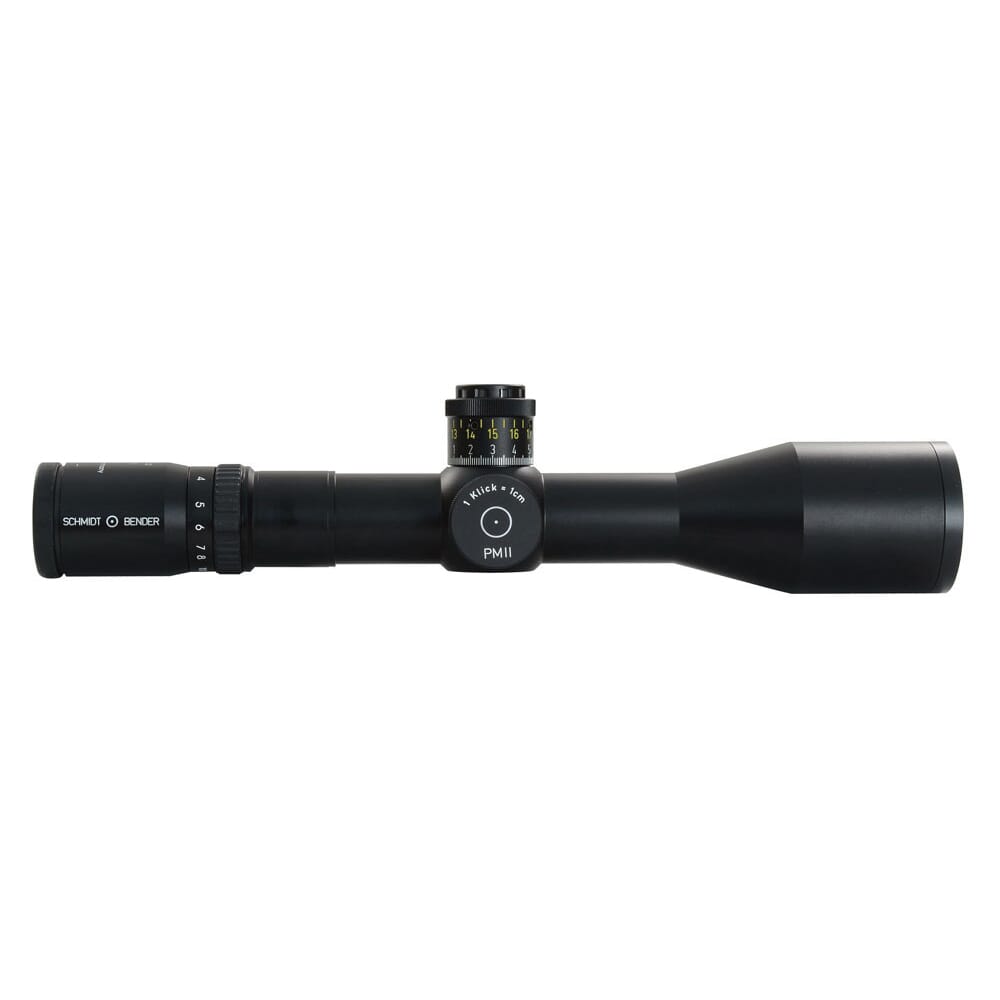 This Schmidt Bender PMII 3-12x50 L/P DT riflescope with an illuminated Gen II mildot reticle, CW, and .1 MRAD offers parallax compensation and illumination adjusting turrets. With the reticle located in the first focal plane, a distance evaluation is permitted in all magnifications.