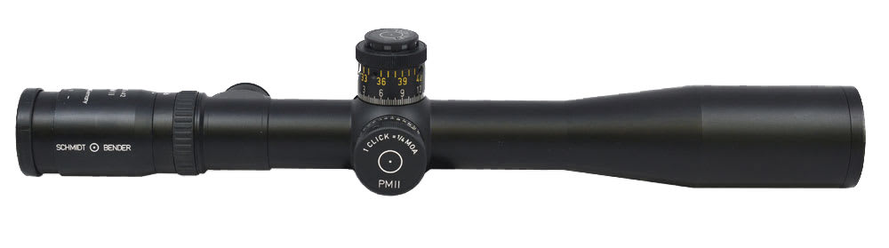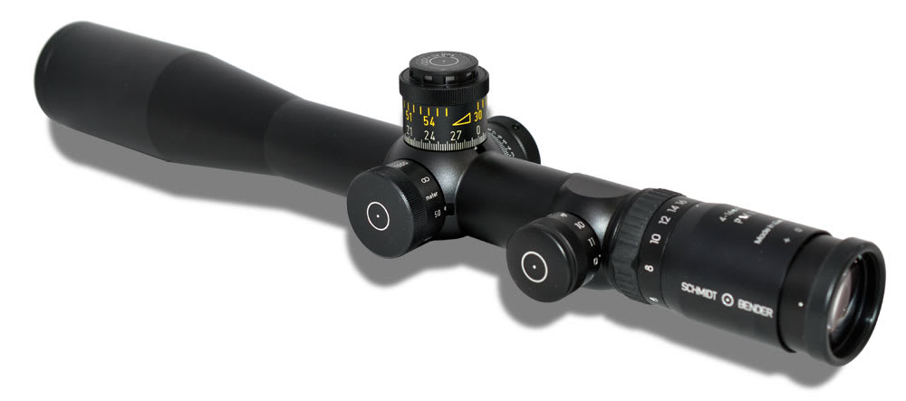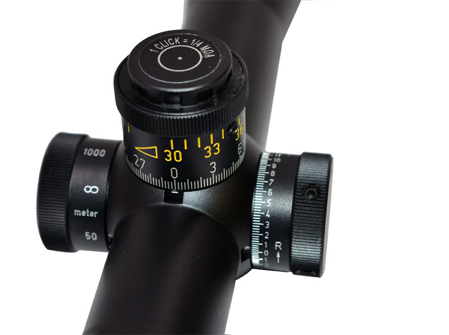 There are two elevation adjustment options: Option One is a single turn, counter clockwise turret with 0.1 Mil click values and 13 MRad/130cm/46.8 MOA of adjustment. Option Two is a double turn clockwise turret with 1/4 MOA click values and 56 MOA total adjustment. Offered with P3 or P4 Fine reticles.