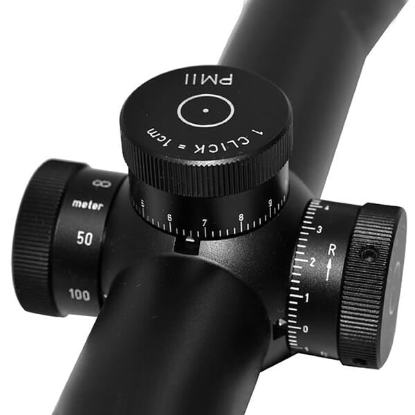 There are two elevation adjustment options: Option One is a single turn, clockwise turret with 0.1 Mil click values and 13 MRad/130cm/46.8 MOA of adjustment. Option Two is a double turn clockwise turret with 1/4 MOA click values and 56 MOA total adjustment. Offered with P3 or P4 Fine reticles.