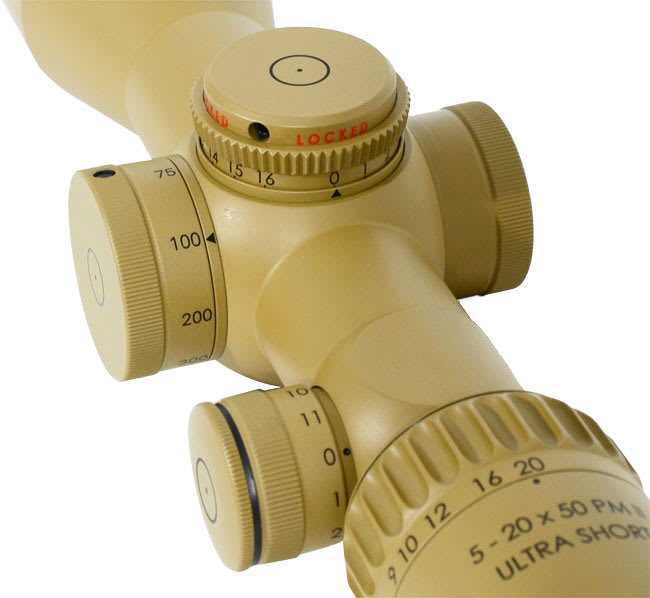 To keep the riflescope as compact as possible, all Schmidt Bender 5-20x50 PMII Ultra Short Riflescopes feature low profile elevation and windage turrets, allowing for the mounting of reflex sights for close range engagements. All Schmidt Bender 5-20x50 PMII Ultra Short scopes come with locking turrets and ZeroClick to ensure the scopes zero is never unintentionally reset or lost. Some elevation turret options for the 5-20x50 PMII Ultra Short also feature Schmidt Bender’s MTC (More Tactile Clicks) technology, allowing for faster and more intuitive adjustments to elevation when engaging targets are varying distances.