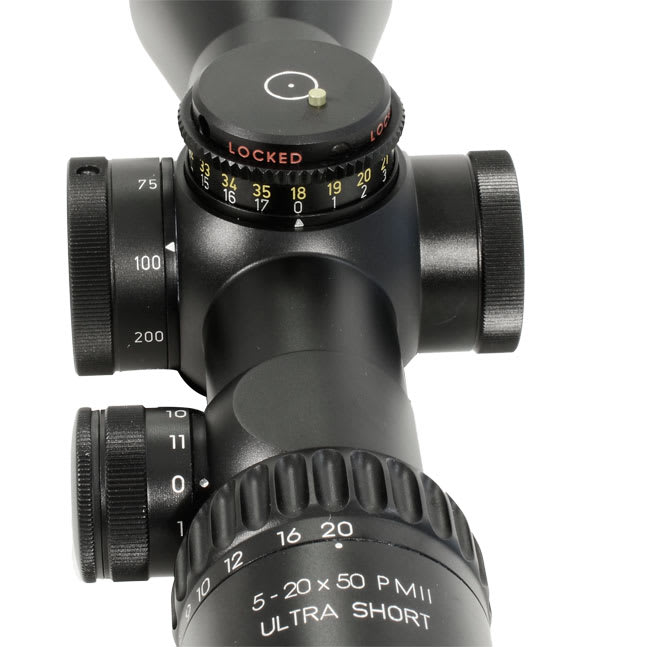 To keep the riflescope as compact as possible, all Schmidt Bender 5-20x50 PMII Ultra Short Riflescopes feature low profile elevation and windage turrets, allowing for the mounting of reflex sights for close range engagements. All Schmidt Bender 5-20x50 PMII Ultra Short scopes come with locking turrets and ZeroClick to ensure the scopes zero is never unintentionally reset or lost. Some elevation turret options for the 5-20x50 PMII Ultra Short also feature Schmidt Bender’s MTC (More Tactile Clicks) technology, allowing for faster and more intuitive adjustments to elevation when engaging targets are varying distances.