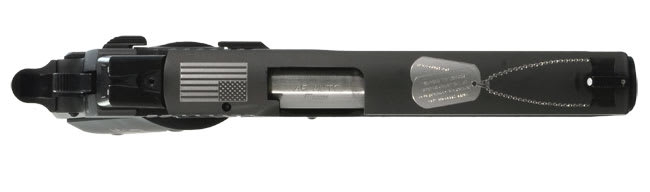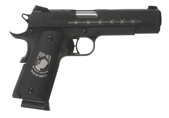 Pay a tribute to our prisoners of war and missing in action military members with this black stainless steel Sig Sauer 1911 POW-MIA .45 ACP handgun which features barbed wire engravings on the slide's sides, dog tags draping the front sight, an American flag engraved on the top of the slide, and POW-MIA flag engraved grips. Other features include low profile night sights and a beavertail grip safety. You are not forgotten.