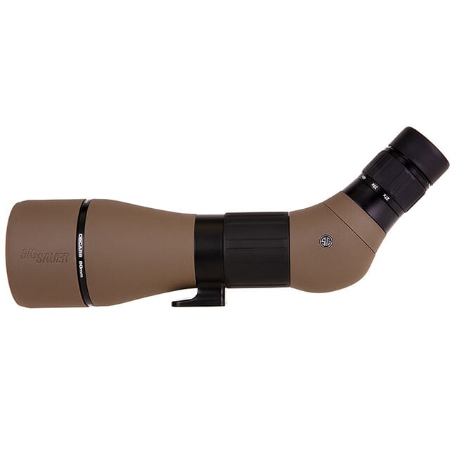 The OSCAR8 is a premium 80mm spotting scope with a 27-55x magnification range and features Sig Sauer's HDX optical system. Combining extra-low dispersion glass, high light transmittance glass, SCHMIDT-PECHAN prism and fully multi-coated lenses - the OSCAR8 Spotting Scope offers an incredible viewing experience. The outside of the scope is outfitted with FDE rubber armor that is durable, non-slip, and helps make the scope waterproof up to one meter.