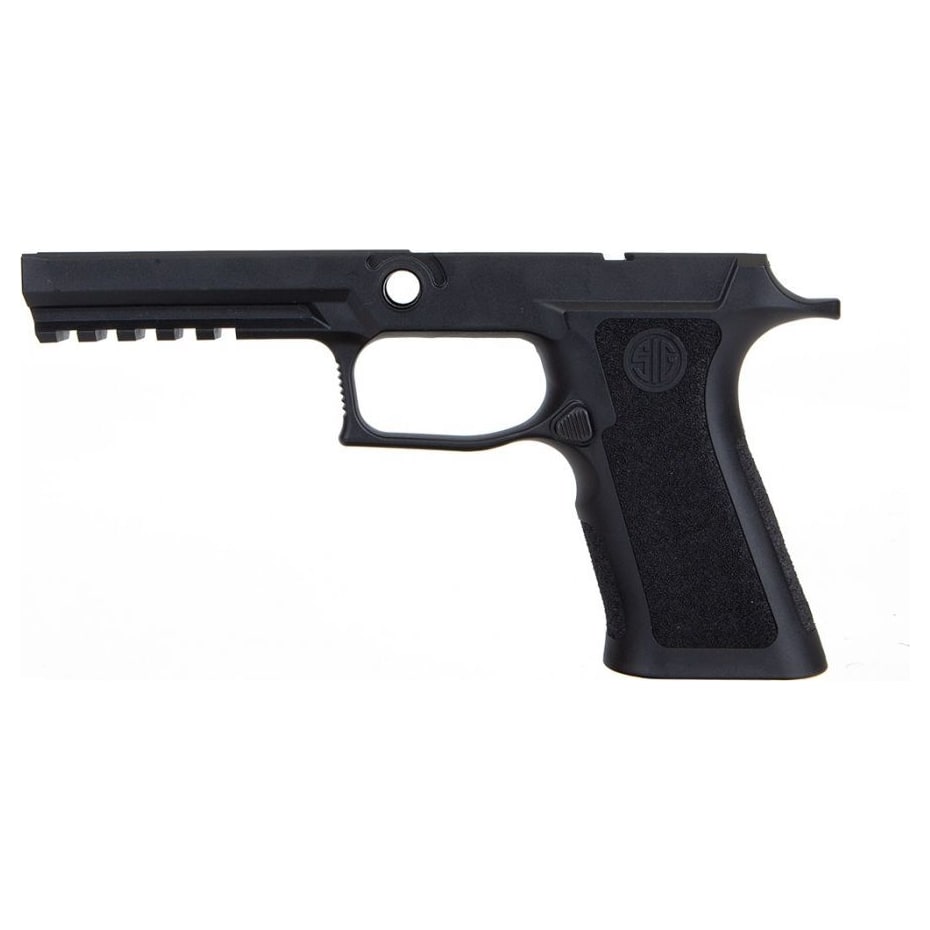 This Sig Sauer P320 X-Series Full Size Grip Module is a premium factory upgrade finished in a black polymer for Fire Control Units without a manual safety. It features the signature X-Series ergonomics, including a deep trigger guard undercut and an extended beavertail, which allow for a higher grip and improved recoil management. The "Large" circumference "Full Size" frame provides a fuller profile for shooters with larger hands while maintaining a full-length rail for 4.7-inch slides and a full-size grip for maximum magazine capacity. This assembly comes ready for installation with a pre-installed, reversible magazine catch and is compatible with internal tungsten weights for added balance.