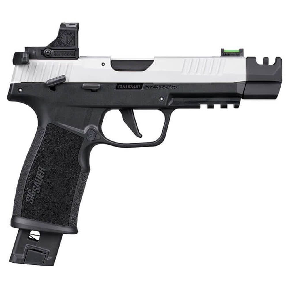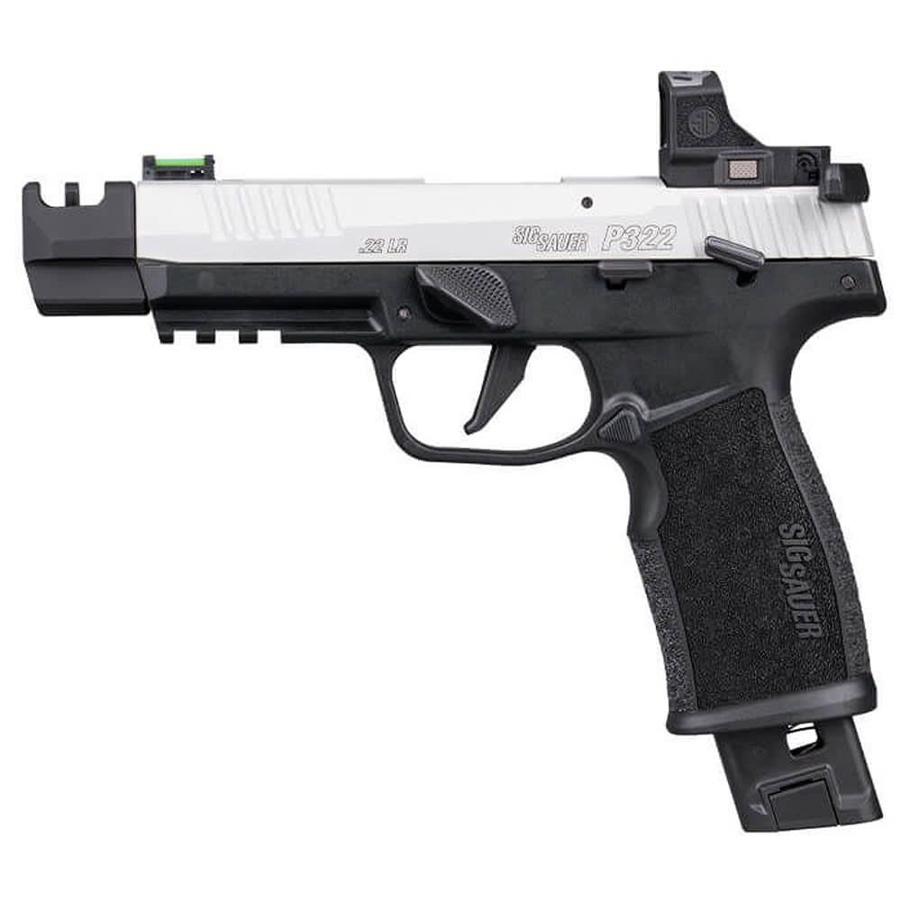 The SIG Sauer P322 Competition is a purpose-built .22LR pistol engineered for speed, control, and precision on the range. Outfitted with a two-tone competition slide, it comes factory-equipped with the ROMEO RS Compact red dot optic and a slide racker for faster target acquisition and effortless manipulation. Its threaded barrel features a 2-port compensator to help reduce muzzle rise, while the sport takedown lever and extended magazine catch enhance handling during rapid-fire stages. Built on a stainless steel FCU with a lightweight polymer grip module and anodized alloy slide, the P322 Competition balances durability with agility. The pistol ships with both a 20-round and 25-round magazine, offering extended capacity for longer strings of fire. Measuring 8.1 inches in length and weighing only 20.5 ounces loaded, this competition-ready pistol delivers reliable performance with a crisp single-action trigger and interchangeable trigger shoes for a customized feel.