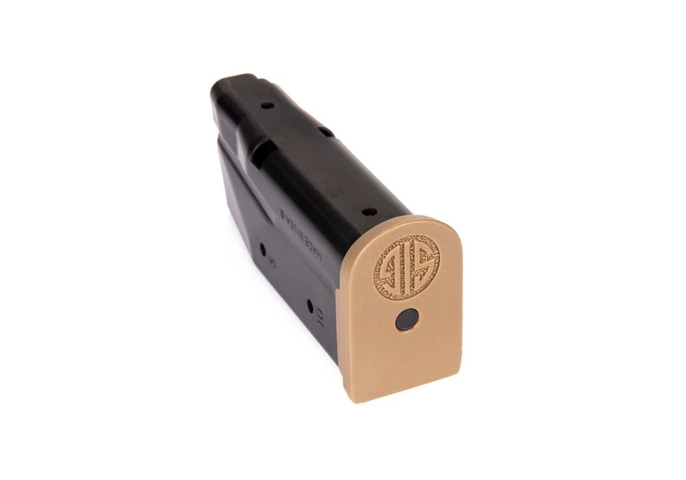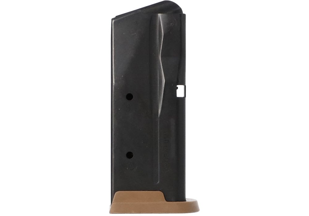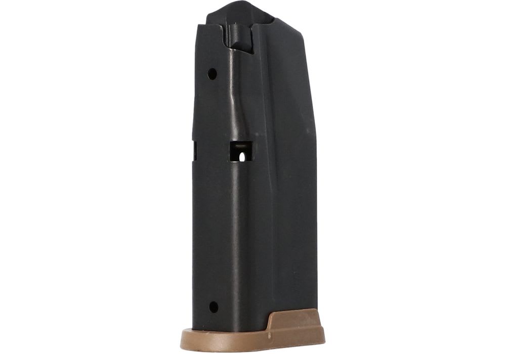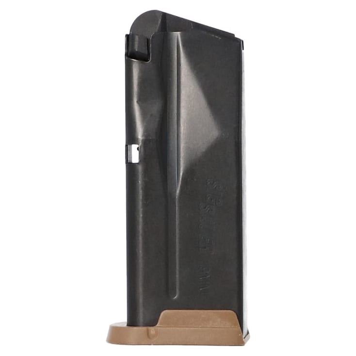 This Sig Sauer P365 10-round magazine is a factory-original accessory constructed from durable carbon steel with a sleek black finish. Specifically engineered for the 9mm micro-compact platform, it features a coyote tan extension baseplate that provides additional surface area for a more secure and comfortable grip. The internal high-tensile spring and anti-tilt follower are designed to ensure smooth, reliable feeding during every cycle of operation. This subcompact magazine is an ideal choice for users in capacity-restricted states or those seeking a seamless aesthetic match for a coyote-toned grip module.