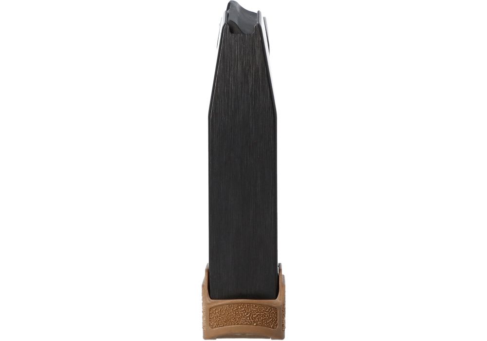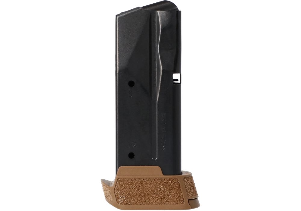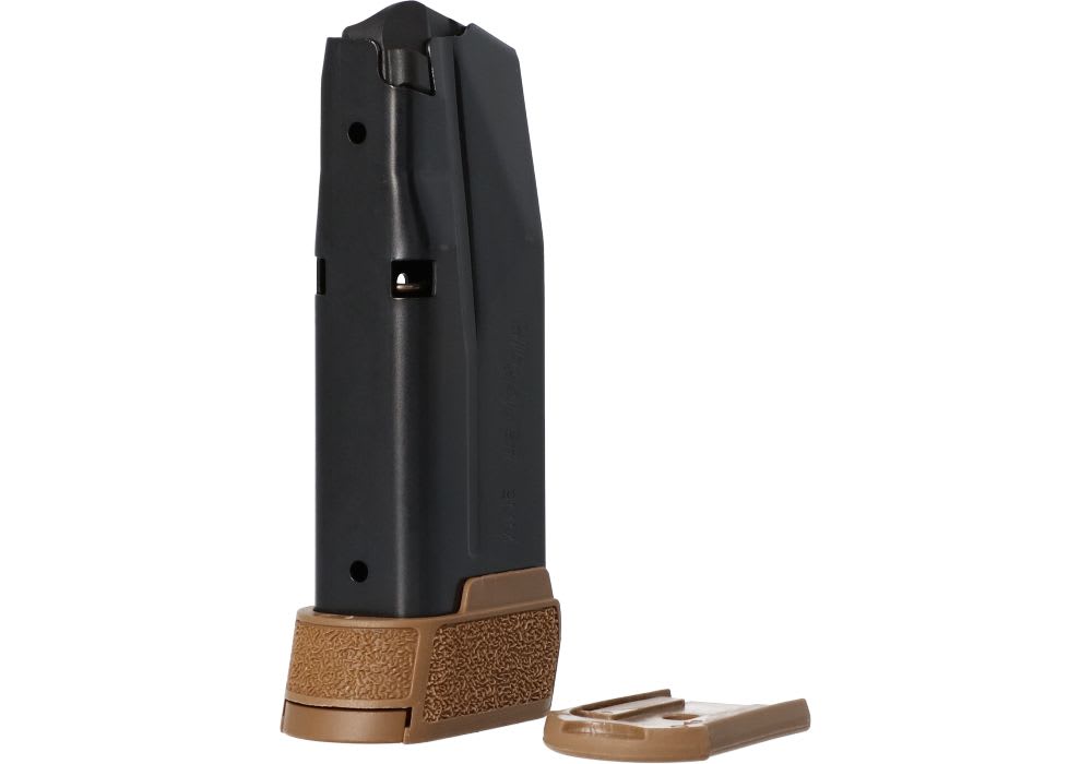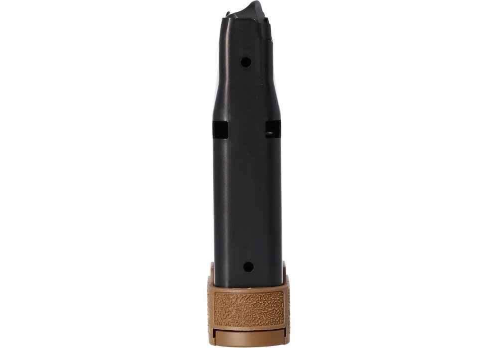 This Sig Sauer P365 12-round Magazine is a genuine factory-original accessory constructed from rugged carbon steel with a black oxide finish. It is specifically designed for 9mm micro-compact models and features a coyote tan extended baseplate that significantly improves ergonomics by providing a full-handed grip. The high-tensile steel spring and polymer anti-tilt follower are engineered for smooth, reliable feeding across all P365 variants. This high-capacity option is a popular choice for shooters looking to maximize their round count while maintaining a seamless aesthetic with coyote-toned grip modules.