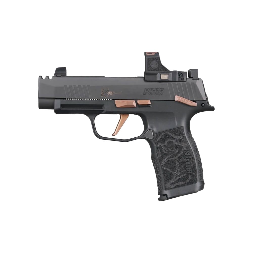 The SIG Sauer P365 Rose Romeo-RS XL Compact 9mm combines sleek styling with modern striker-fired performance in a compact, carry-ready package. With a 3.1" barrel, black frame and rose-gold accents, and a minimalist MS grip module, this pistol balances concealability with reliability. Outfitted with a 3 MOA red-dot optic and two 12-round steel magazines, it’s ready for everyday carry or defense right out of the box. The compact size, dependable 9 mm chambering, and modern finish make the P365 Rose Romeo-RS XL a refined choice for shooters who want practicality, comfort, and style together in a purposeful package.