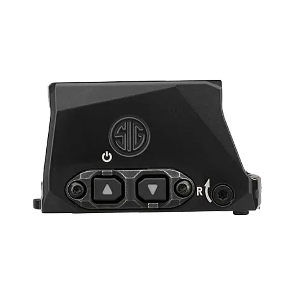 The ROMEO-X SIG-LOC is powered by a single CR1632 battery and features a minimum continuous runtime of 20,000 hours at the medium brightness setting. The battery compartment is side-mounted, allowing the battery to be changed without removing the optic from the pistol. The ROMEO-X SIG-LOC’s is available with 3 reticle options, a 2 MOA Dot / 32 MOA circle combination, a 3 MOA Dot, or a 6 MOA Dot. Other features of the ROMEO-X SIG-LOC include independent brightness adjustment buttons that are recessed within a protective plate which can be activated even with gloves on. Buttons have bump features above UP and below DOWN, so they can be determined by feel.