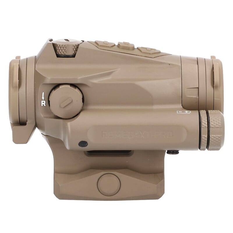 Sig Sauer’s ROMEO4XT-PRO was developed with input from professional end-users and comes packed with a wide assortment of upgrades and exclusive features. The ROMEO4XT-PRO is powered by the commonly available AAA battery and features a runtime of 50,000 hours. The cap to the battery compartment is tethered, ensuring you won’t lose the cap during battery changes in high-stress situations. At the request of industry professionals, the ROMEO4XT-PRO’s power and illumination control was moved from the left side to the 12 o’clock position – this was done to make the optic ambidextrous, and reduces the chance of snagging on plate carriers or chest rigs when the host rifle is in the slung position. The ROMEO4XT-PRO has also been optimized for use with night vision devices. This is evident in the optic’s dedicated night vision override switch for instant transition to a night vision compatible brightness, as well as Sig’s exclusive D.A.R.C. (Dark Adaptive Reticles & Coatings) Technology which utilizes special lens coatings and reticle brightness settings for optimal performance with GEN 3+ night vision devices. Other features of the ROMEO4XT-PRO include a multi-segment reticle, allowing the user to choose between a simple dot reticle, a 3-dot bullet drop compensation reticle, a dot in the middle of a ring, or a 3-dot bullet drop compensation reticle in the middle of a ring. In addition, the ROMEO4XT-PRO is designed to withstand the worst possible conditions with a housing precision CNC machined from solid aluminum to stand up to recoil and impacts and a IPX8 waterproof rating.
