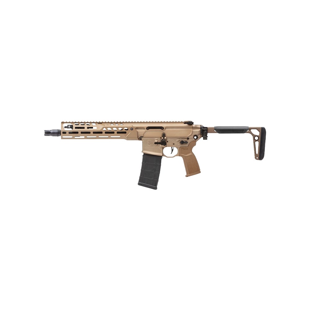 The SIG MCX SBR is a compact, short‑barreled 5.56 NATO rifle built on the modular MCX platform. This SBR features an 11.5‑inch barrel, folding + telescoping stock for compact transport and adjustable length‑of‑pull, a top Picatinny rail with iron sights (IR), and an M‑LOK handguard for accessories. The MCX uses modern short‑stroke piston/robust operating components and is intended for versatile duty, range, and CQB use.