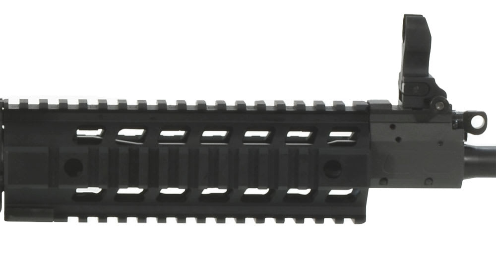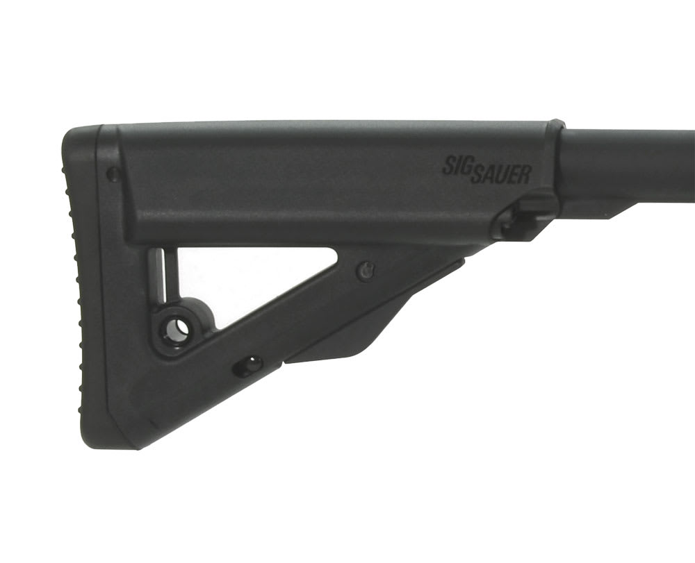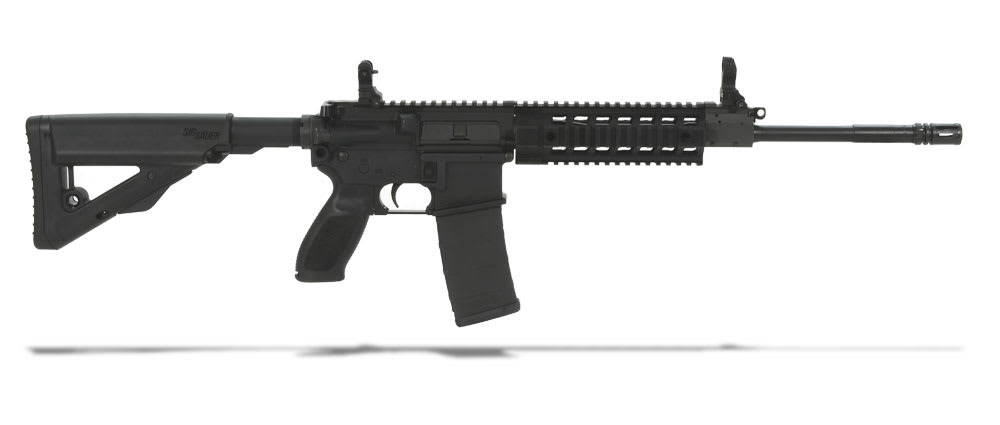 A 16" chrome-lined barrel is chambered in 5.56mm NATO and is surrounded by a free-floating aluminum forend. The top rail is optic-ready and includes SIG SAUER flip-up iron sights.