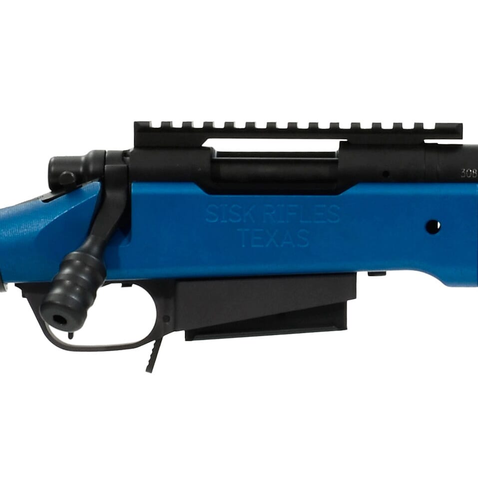 This Sisk STAR 308 Win rifle features a Remington 700 right-hand short action, #7 contour Lilja stainless steel match grade barrel, Timney trigger, blue STAR stock with a F-1 forearm, Surefire flash suppressor kit, STAR triggerguard, one 5 round magazine, Talley picatinny rail mount on receiver with 8x40 screws, and a STAR tactical bolt knob.