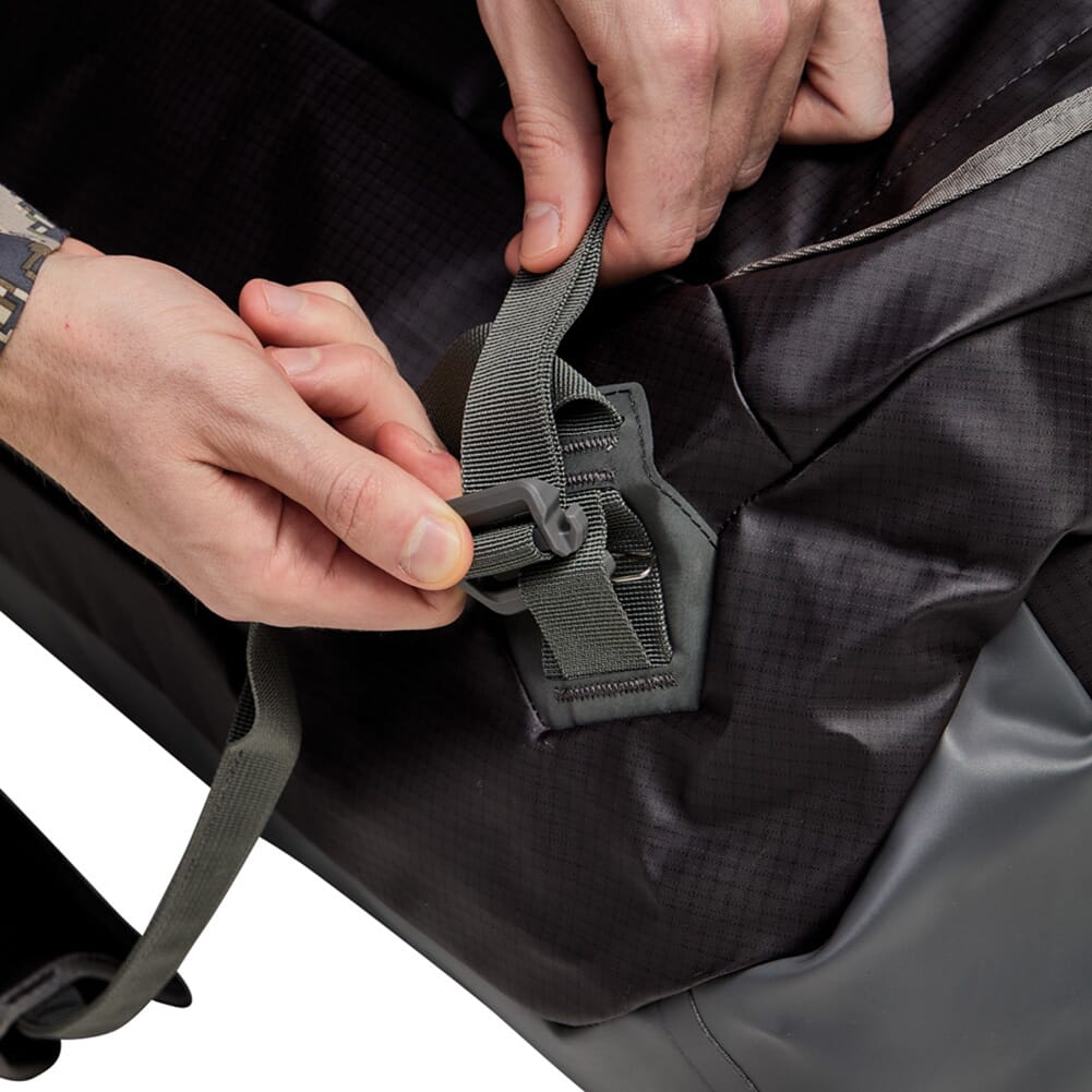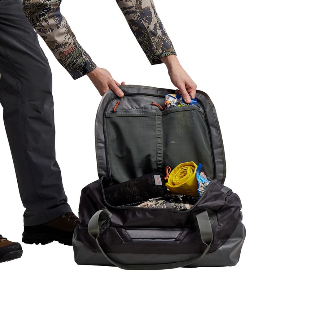The Sitka 50 Liter Drifter Duffle is the perfect size to accompany you on the plane with your optics, electronics and a change of clothes. The highly water-resistant 150D TPU coated rip-stop fabric and water-proof 450D welded TPU coated rip-stop floor keep your gear dry when transiting in a boat, on horseback or flying home with memories. The removable shoulder straps make carrying gear easy and the four side handles and top carry handle assure you'll keep grabbing for this bag on every adventure. The zippered pocket on the top lid help organize documents and magazines while the 3 internal mesh pockets keep gear sorted and clean from dirty clothes.