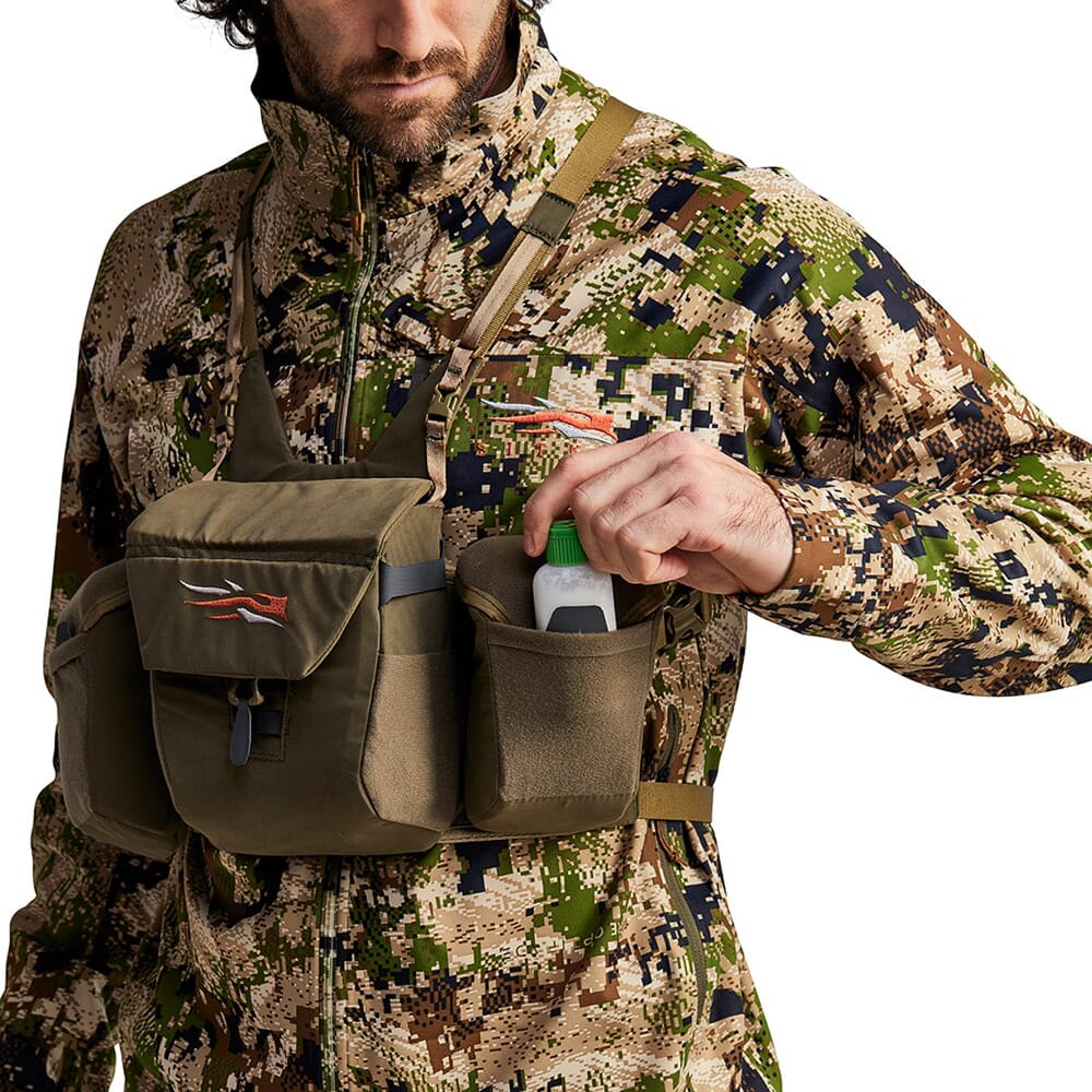 Sitka Gear knows that when you're hunting, you don't have time to make sure all of your electronics, optics, mobile devices, and other accessories, are not only secure, but easily accessible - that's why they came up with the Sitka Gear Mountain Optics Harness. This versatile harness has a quiet magnetic one-handed front flap for your binoculars for quick, and more importantly, quiet access. The modular side-pockets are removable, and can hold GPS, cellphones, rangefinders, or any other accessory a hunter might need on the go. If you want secure storage, the Sitka Gear Mountain Optics Harness has you covered there too with a zippered stash pocket on the back of the chassis. There are also numerous elastic pockets to hold your wind gauge and calls, so nothing you need is out of reach. Brushed polyester face fabric rounds out this harness, to ensure your silent stalks stay as silent as possible. The Sitka Gear Mountain Optics Harness is one thing you won't want to go hunting without!