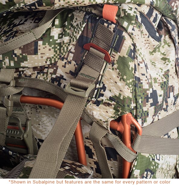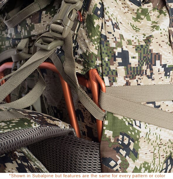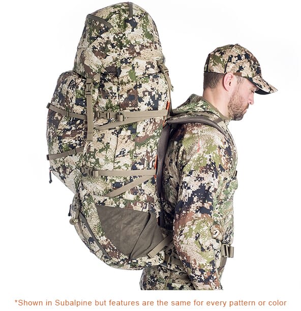 The Sitka Big Game Subalpine Mountain Hauler 6200 opens a world of opportunity for the committed backcountry hunter willing to work harder and go further to enhance their mountain pursuit. The primary bag expands from 4,000 to 5,000 cubic inches to easily place an elk quarter on the load-hauling shelf, and gear can be separated and stowed internally below the load shelf in the Mountain Hauler Dry Bag.