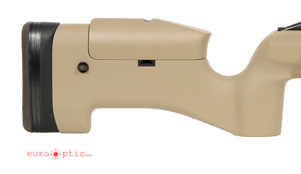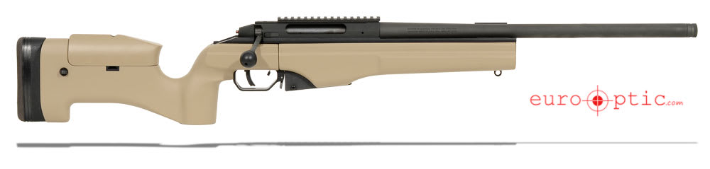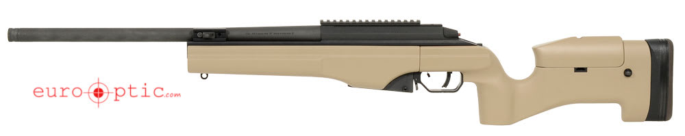 This Sako TRG 42 .338 Lapua rifle features a desert tan fixed stock, 3-locking lug bolt, phosphate metal finish, double plungers, picatinny rail, and 20" barrel.