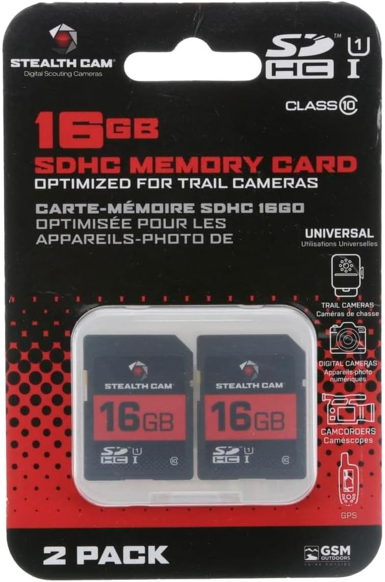 The Stealth Cam 2 Pack of 16GB SD Cards (STC-16GB2PK) provides a reliable and efficient storage solution for trail camera users who need dependable performance in the field. Each 16GB card offers plenty of space for high-resolution photos and video clips, making them ideal for routine scouting, wildlife monitoring, or property surveillance. Designed to deliver consistent write speeds and stable operation, these cards help ensure your camera captures every moment without lag or missed frames. Compatible with a wide range of Stealth Cam models and other devices that accept standard SD cards, this 2-pack gives you the flexibility to rotate cards during camera checks, keep an extra on hand as backup, or run multiple cameras with ease. Durable, practical, and field-ready, these SD cards support smooth and uninterrupted data collection for any outdoor setup.
