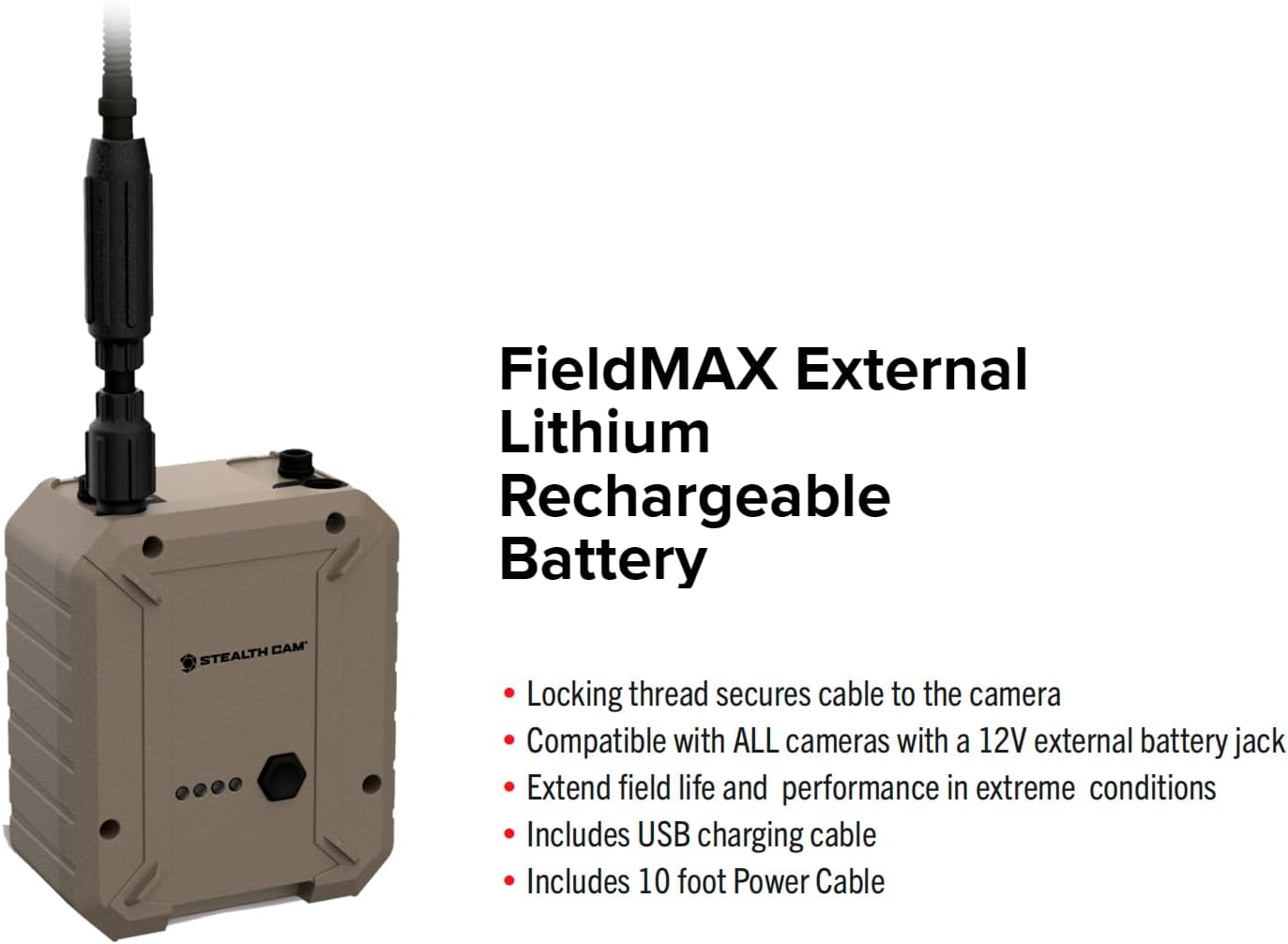 The Stealth Cam FieldMax External 5000 mAh Lithium Rechargeable Battery (STC‑ERLP5) is a rugged, high‑capacity external power pack that turns your trail camera into a long-term, low‑maintenance surveillance solution. Designed to plug into any camera with a 12‑volt external battery jack, it eliminates the constant hassle of swapping disposable batteries by delivering stable, reliable power over extended periods. With its 5,000 mAh lithium‑ion battery and included insulated 4‑foot cable, installation is quick and flexible. Whether you’re mounting the camera on a tree, post, or other remote location. Built for the outdoors, it stands up to harsh weather and wide temperature swings, making it ideal for year‑round use. For hunters, wildlife monitors, or property watchers, this battery pack ensures that your camera stays alive and active, even through weeks or months of deployment, letting you “set it and forget it.”