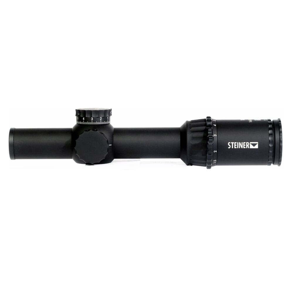 Steiner’s T6Xi 1-6x24mm Riflescope is an ideal choice for rifle setups intended for mid-range engagements. This first focal plane optic utilizes the KC-1 reticle, which is composed of a precise, illuminated center cross with hashmarks to compensate for bullet drop, surrounded by a large red ring. This reticle allows the user to use the T6Xi 1-6x24mm Riflescope to engage targets at close range when set to 1x magnification, and make exact long range shots when set to 6x magnification. Other features of the T6Xi 1-6x24mm include exposed windage and elevation turrets, allowing the user to make adjustments in the field without the use of tools. In addition, the T6Xi 1-6x24mm features a throw lever for rapid magnification changes.