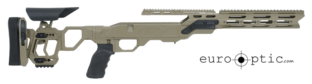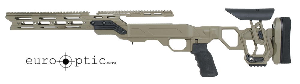 Cadex' Field Tactical chassis was designed primarily with law enforcement sharpshooter personnel in mind. The primary difference between this series and some of Cadex' other chassis is a fixed, rather than folding, butt stock. This is a feature that appeals to many shooters, if for nothing more than the slight weight savings that it has over a same-model chassis with a folding stock, as well as the completely solid arrangement which may have some advantages over a folding design. At 5.5 - 5.58 lbs., these chassis fall within the mid-range of weight offered by Cadex.