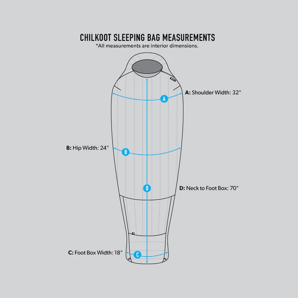 Designed for warmth in extreme cold, the Chilkoot 0° Sleeping Bag is a must have addition to any hardcore mountain hunter's kit. It comes equipped with responsibly sourced 850+ fill power goose down insulation with a 90/10 cluster fill ratio to keep the warmth in and the cold out. To maintain a consistent loft throughout the entire bag, the liner and shell are differentially cut to prevent the compression of the down. The interior and exterior lining is made from 100% Pertex Quantum nylon. This unique fabric features a wide fused yarn to create a tighter weave to enhance the DWR (durable water repellent), improves loft, and increases overall durability. The Chilkoot 0°'s baffle seams are pintucked and the baffle stitching is shielded this increases moisture protection and protects the stitching from abrasion for added durability. An articulated hood boasts a uniquely designed insulated neck cuff with an elastic and magnetic closure to seal in heat. A weight conscious 2/3 length reverse coil YKK zipper is paralleled by Dacron tape to reduce zipper snagging.