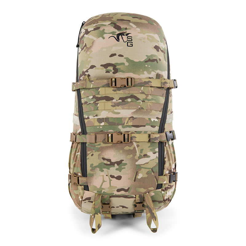 The 3300 also integrates with the color-coded buckles on the R3 Frame to quickly attach and separate the bag from the frame to utilize the 2,500+ cubic inch load shelf for added volume capabilities. A heavy weapon system with multiple positioning options is integrated into the frame for secure-and-supported carry of long-range large calibers with large optics.