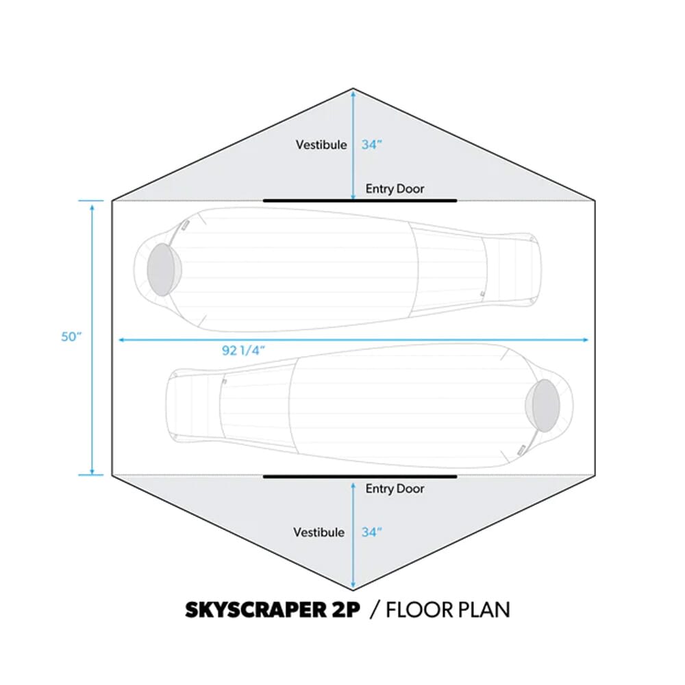 Built to fit the unique needs of the backcountry hunter, the Skyscraper 2p is a light, durable tent that's easy to set up in the wind, can withstand heavy snow loads, and is well suited to every season. With a packaged weight of 5lbs 1oz, the Skyscraper 2p offers an excellent strength to weight ratio thanks to the exclusive WebTruss technology. This unique construction system provides unmatched strength, a low wind profile, and makes pitching the tent a breeze. The WebTruss is formed from 6/6 nylon fabric, and the tent fabric is composed from a combination of 15D and 20D nylon ripstop fabric. The body of the tent is supported by lightweight and durable 10.65mm DAC poles. Additionally, the Skyscraper 2p's door shape allows the top of the door to be opened and folded down for ventilation and a top zipper pulls on vestibule doors are shortened to prevent accidentally grabbing the top when zipping the door.