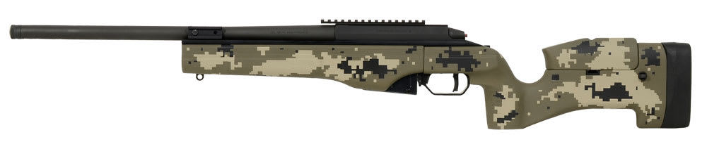 This .308 Sako TRG 22 rifle has a Desert Digital Camo Fixed Stock, Phosphate Metal Finish, picatinny rail, and 20" barrel.