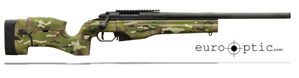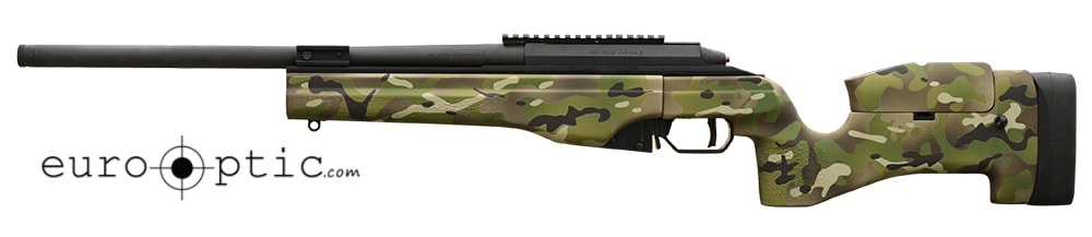 Sako TRG-22 .308 Win rifle is a thoroughbred 300 m UIT standard competition rifle, a CISM competition winner, and the a primary sniper rifle for many governments. Features include a multi camo fixed stock, blued receiver and barrel, black bolt, solid vault-like action cold hammer forged from steel alloy, integral 17mm axial scope mounting rails, integral recoil stop-slots on top of receiver, three locking lugs, detachable staggered 2 row magazine, and a 60° bolt lift for fast bolt throw.