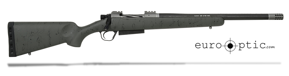 This 6.5 Creedmoor Christensen Arms Summit CF rifle features a green stock with black webbing, 20" carbon wrapped barrel with 1:8" twist, titanium muzzle brake, soft case, match trigger, removable drop mag box, mini M16 style extractor, and integral picatinny rail.