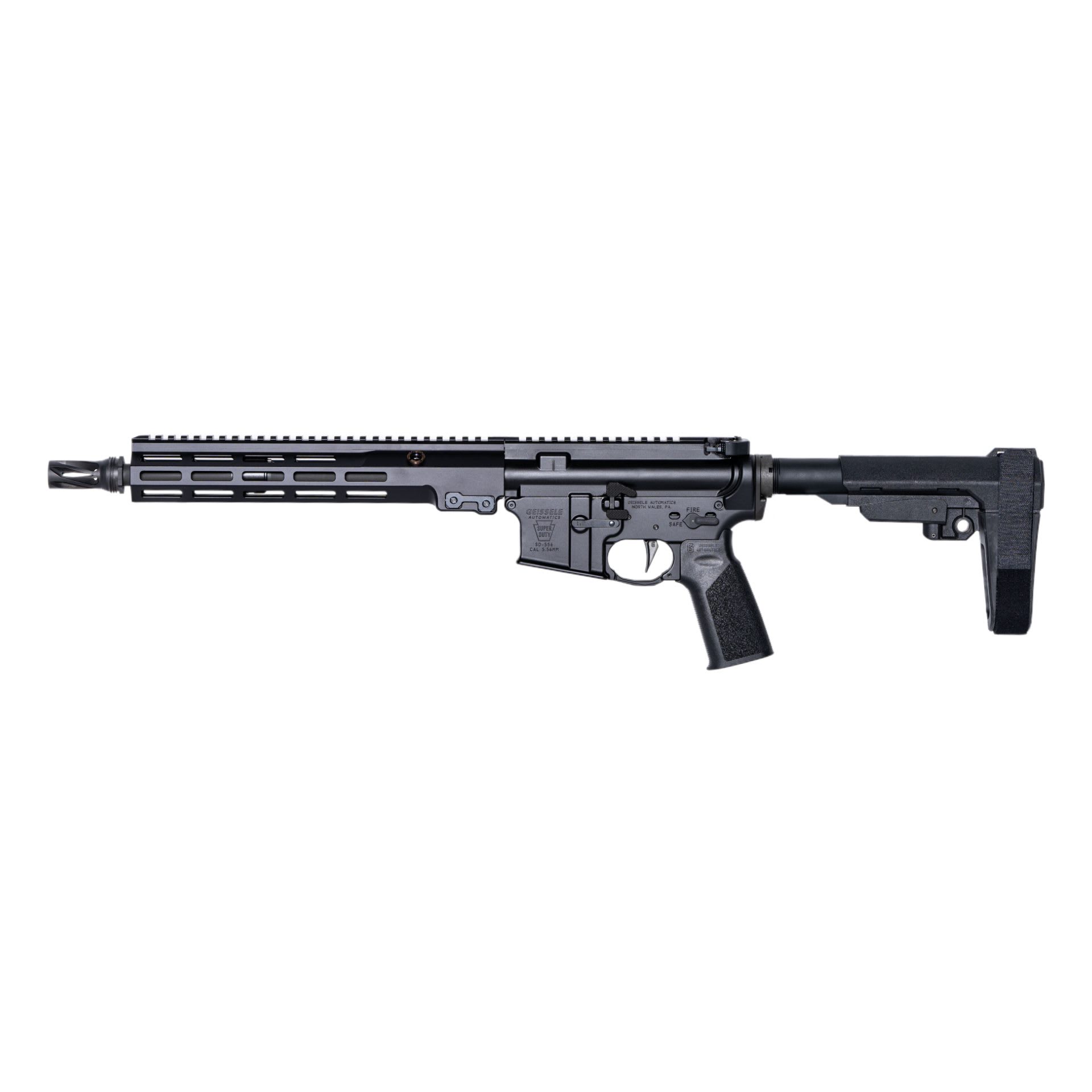 The Super Duty MOD1 Pistol is an upgraded version of Geissele's popular Super Duty series of firearms. The barrel is precision machined and cold hammer forged out of the highest quality steel, featuring a manganese phosphate coat and a chrome lining for excellent resistance to the elements. The barrel is topped with an HUXWRX Flash Hider-QD 556 suppressor-ready muzzle device. One of the Super Duty MOD1 Pistol’s more notable features is Geissele’s own Reliability Enhanced Bolt Carrier Group. This BCG is Nanoweapon coated and features a gas key that’s been properly staked, torqued, and is lined with chrome. Adding to the Reliability Enhanced Bolt Carrier Group’s performance is a cam pin machined from H13 tool steel with a Nanoweapon coating for corrosion/wear resistance, and extended upper rails are included to provide greater stability and improve feeding reliability. Another feature of the Reliability Enhanced Bolt Carrier Group is its Stressproof Bolt, which is precision machined from Carpenter 158+ barstock – a material that is cleaner, has less impurities, and offers greater strength and fatigue resistance.