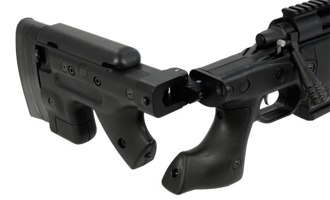 This Surgeon Scalpel .223 Remington rifle features an AI folding stock, black ceracote finish, jewell trigger, 2-position trigger safety, 20" fluted barrel, picatinny rail, and integral recoil lug.