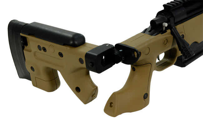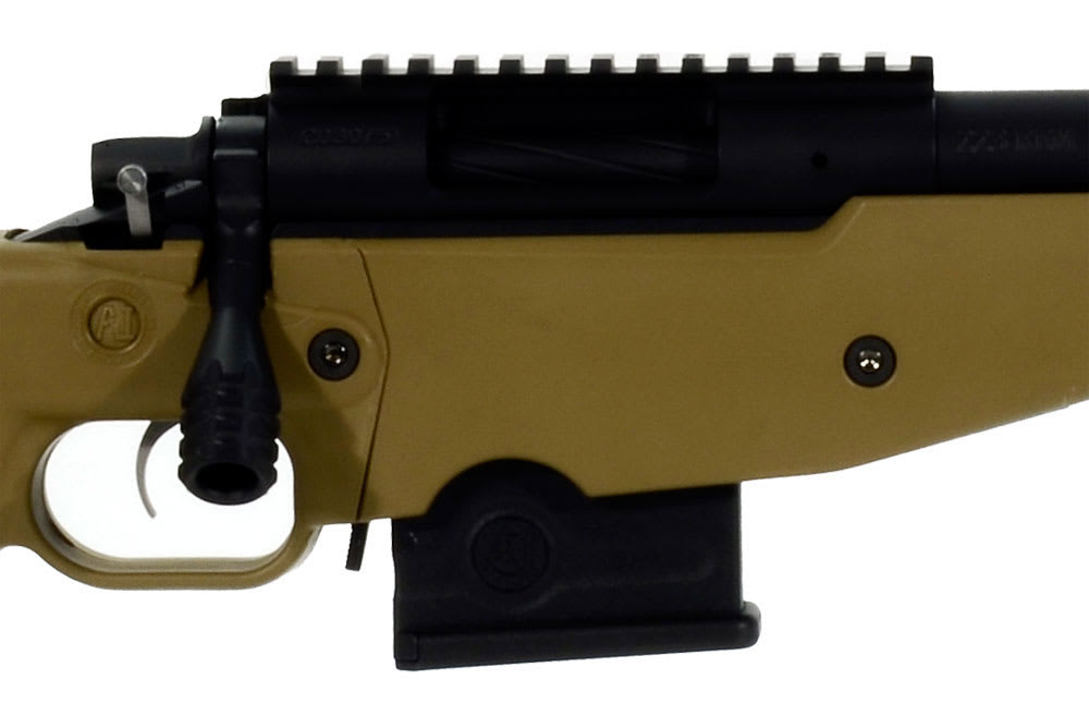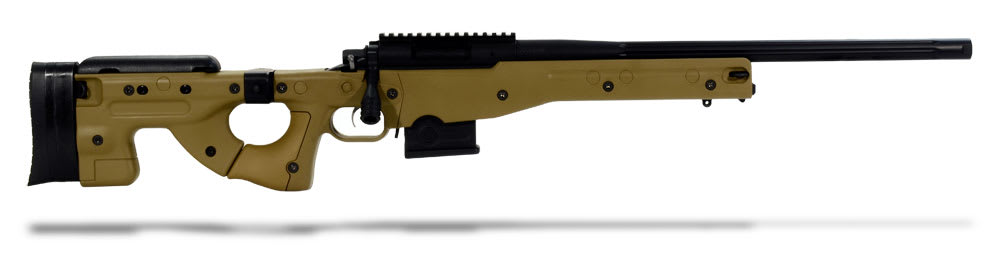 This Surgeon Scalpel .223 Remington rifle features an AI folding stock, flat dark earth ceracote finish, jewel trigger, 2-position trigger safety, 20" fluted-threaded barrel, picatinny rail, and an integral recoil lug.