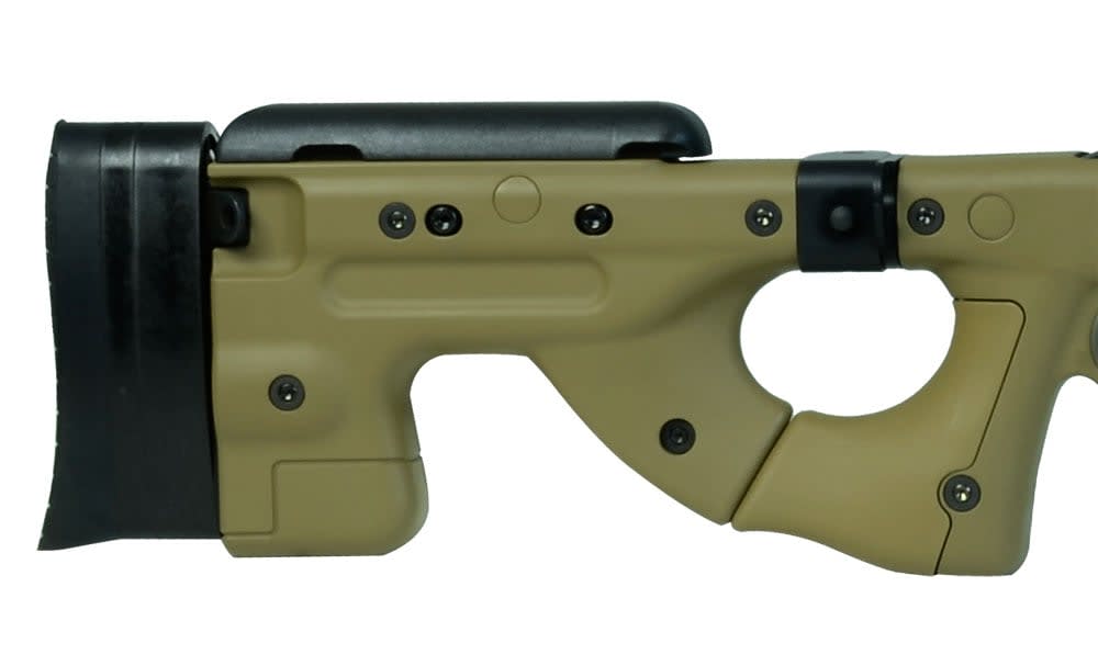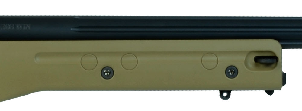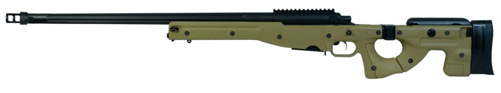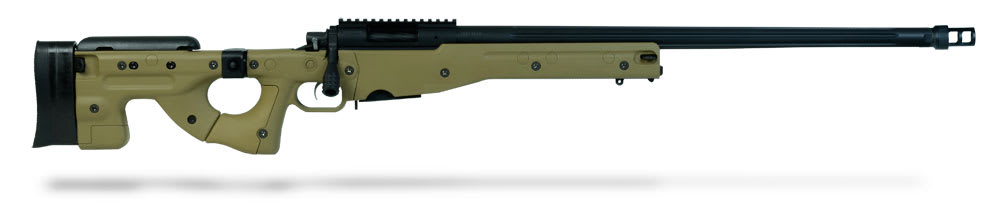 This Surgeon Scalpel chambered in .308 Winchester rifle features an AI folding stock, flat dark earth Cerakote finish, Jewell trigger, 2-position trigger safety, 24" Krieger stainless match fluted-threaded barrel, Badger FTE brake, picatinny rail, and integral recoil lug.