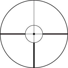 The CD reticle features a circle dot configuration for quick target acquisition. Three medium weight and length posts at 3,6, and 9 o-clock draw your attention to the center of your line of sight. A single dot indicates the intersection of fine cross hairs and single vertical stadia. An unobtrusive circle sits on the posts, surrounding the cross hair & dot intersection. Second focal plane positioning of the reticle maintains its size throughout the zoom range.