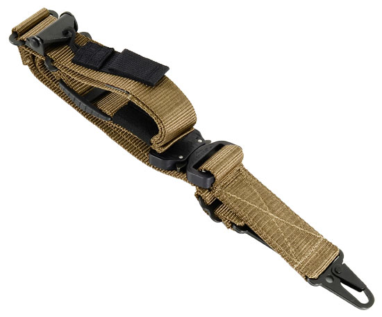 This coyote TAB RAS, or Rapid Adjust Sling, features elite buckles and HK hooks. With an adjustable loop for shooting support, the RAS allows the shooter to easily adjust the sling for slung up positions as it fits the entire body rather than just the shoulder.