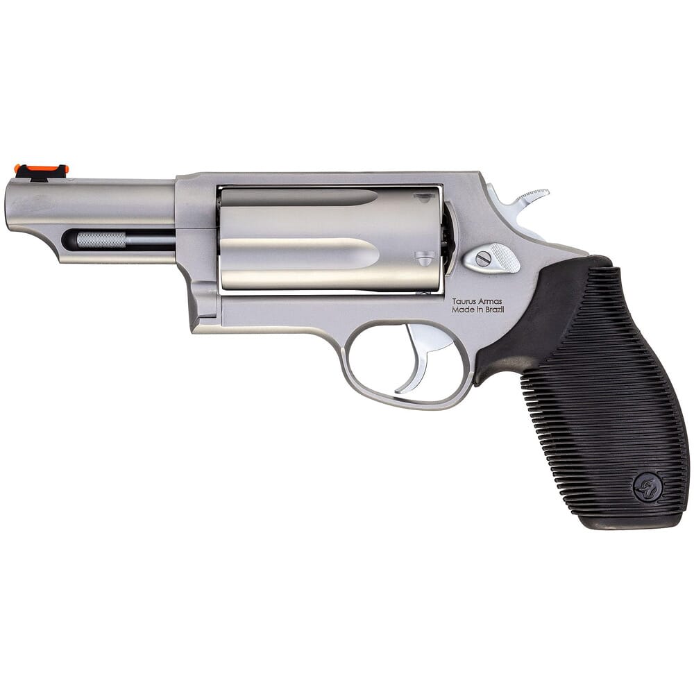 The Taurus Judge Magnum delivers an innovative and highly effective solution to close range personal and home defense. It utilizes a five-shot cylinder that holds both .45 Long Colt cartridges, as well as 3" .410 bore shot shells. Its .410 chambering makes the Judge Magnum an outstanding choice for applications in confined spaces such as in a vehicle or in a building, and the multiple projectiles increase hit probability while also reducing the risk of over-penetration. The Judge Magnum’s .410 compatibility also allows the user to tap into the sheer amount .410 loads, including buckshot, birdshot, slugs, and other cartridges. In addition to its excellent self-defense potential, the Judge Magnum makes for a perfect pest-control pistol, and can be carried on the trail as a “snake-gun”. In addition, the cylinder, barrel, and frame are constructed from a high-strength steel alloy, and an ergonomic black rubber grip helps alleviate felt recoil.