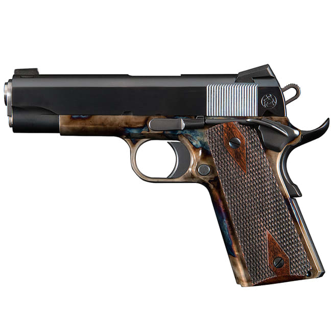 Resembling the look and feel of 1911 pistols built during WWI, the .45 ACP Turnbull Commander Heritage pistol features hand-polishing, Fixed low profile sights, Skeletonized Hammer , safety lock with knurled undercut thumb piece, hand checkered American black walnut double diamond grips, WWI style ejection port, solid one piece steel trigger, color case hardened frame, charcoal blued balance, and nitre blued pins, screws, slide stop, and thumb safety. Includes 2 two-tone magazines.