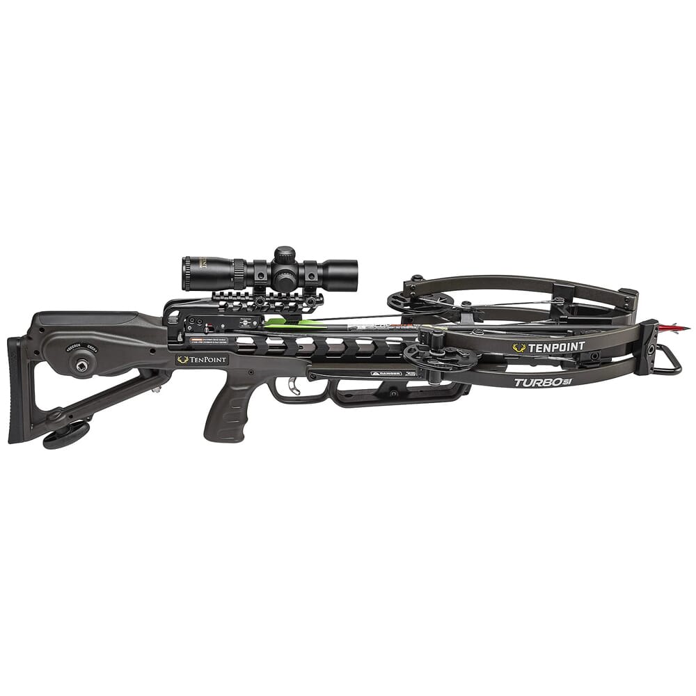 TenPoint’s Turbo S1 Crossbow combines high performance and affordability. Measuring in at just 31 inches, the Turbo S1 is one of the shortest forward-draw crossbows on the market. Despite its compact size, the Turbo S1 is still able to send bolts downrange at a ripping 390 feet per second thanks to its advanced RX-6 cam system. To make cocking the crossbow easy, the Turbo S1 is equipped with the exclusive ACUslide cocking system. This allows the shooter to cock the crossbow with a mere 5 pounds of force, and can be used to de-cock the crossbow by backwinding the handle. For enhanced trigger control, the Turbo S1 comes standard with TenPoint’s S1 trigger. The S1 utilizes an advanced roller-sear system for a consistent, 2-stage pull of 3.5 lbs. In addition, the Turbo S1 ships with TenPoint’s RangeMaster Pro Scope. This optic requires no adjustment for distance, and utilizes three duplex crosshairs calibrated for 20, 30, 40, and 50 yards, as well as a triangle for targets to 60 yards.