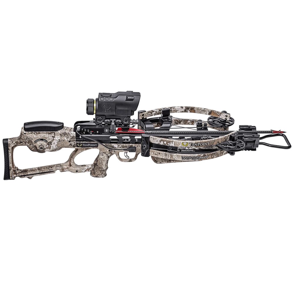 The Vapor RS470 Crossbow by TenPoint represents a major leap forward in crossbow technology with its unique reverse draw design. This distinctive design places the limbs opposite of where regular crossbow limbs would be, and in doing so provides an exceptional 17-inch power stroke. This means that the nock remains engaged with the string longer before being released, which in turn enhances accuracy and speed. In addition, this Vapor RS470 is equipped with the Garmin XERO X1i rangefinding scope. This advanced optic can accurately measure target distances up to 250 yards away, and allows the user to create different profiles for different setups. The Garmin XERO X1i also has the Laser Locate function, this feature marks where your shot was taken and sends the data to a compatible Garmin device. The user can then use this to create waypoints and help track downed game.