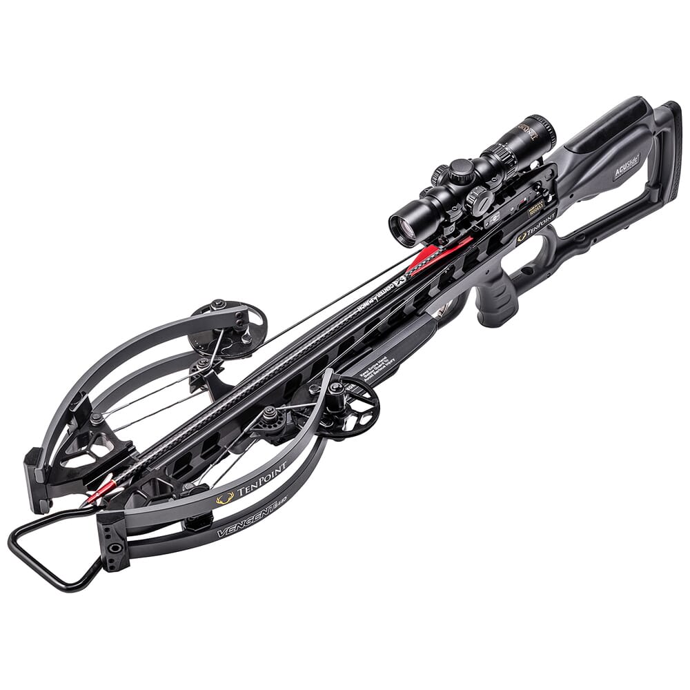 The Vengent S440 Crossbow is TenPoint’s narrowest crossbow available at a mere 5.8 inches wide when fully cocked. It comes equipped with TenPoint’s own ACUslide Cocking and De-Cocking system, which allows the user to cock/un-cock the crossbow by cranking a handle. This unique system allows the whole process to be paused at any time without the risk of personal injury, damaging the crossbow, or losing control. The Vengent S440 also features the S1 2-stage trigger, which locks at full draw and keeps the trigger box in the same location, resulting in a 48% increase in accuracy. In addition, this crossbow comes with the Rangemaster Pro Scope which has illuminated aiming points to compensate for arrow drop.