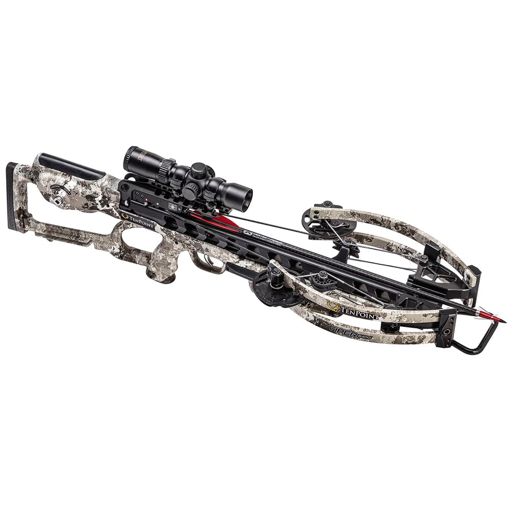 The Viper S400 is the shortest crossbow made by TenPoint at a mere 32 inches long. It comes equipped with TenPoint’s own ACUslide Cocking and De-Cocking system, which allows the user to cock/un-cock the crossbow by cranking a handle. This unique system allows the whole process to be paused at any time without the risk of personal injury, damaging the crossbow, or losing control. The Viper S400 also features the S1 2-stage trigger, which locks at full draw and keeps the trigger box in the same location, resulting in a 48% increase in accuracy. In addition, this crossbow comes with the Rangemaster Pro Scope which has illuminated aiming points to compensate for arrow drop.