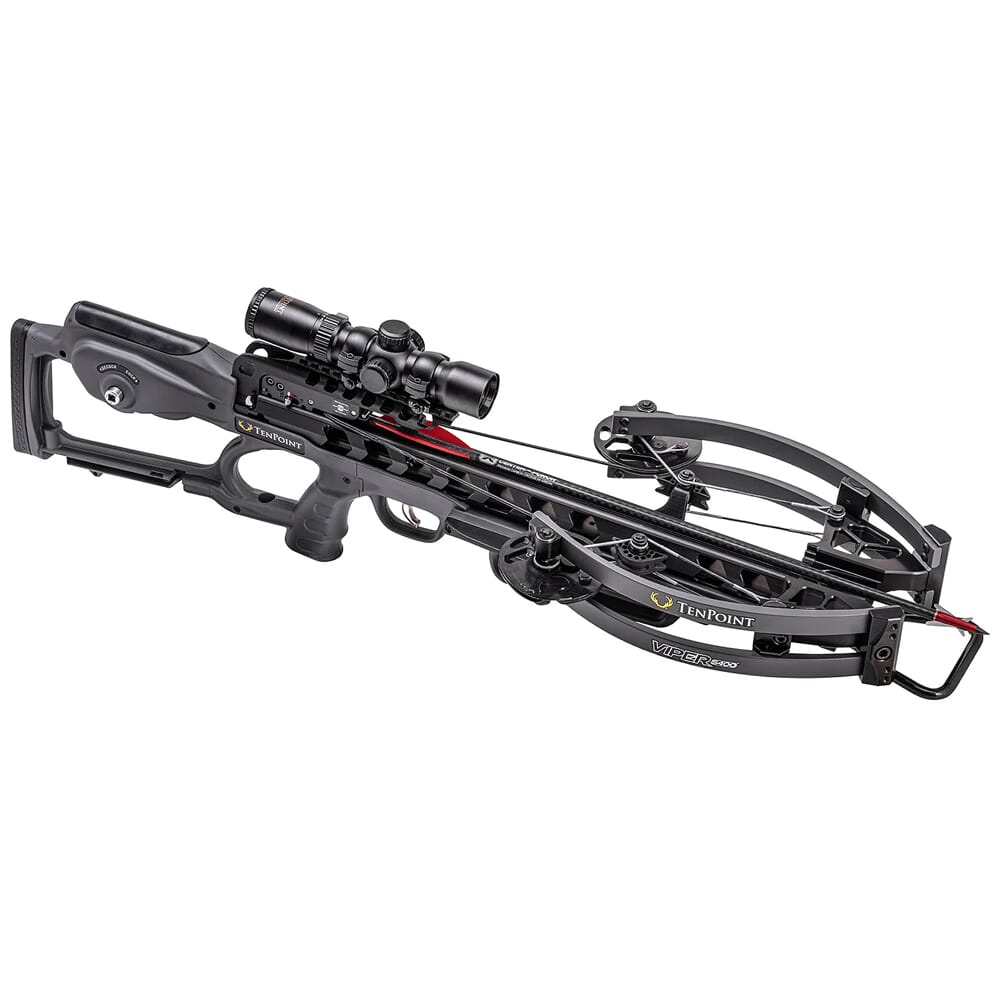 The Viper S400 is the shortest crossbow made by TenPoint at a mere 32 inches long. It comes equipped with TenPoint’s own ACUslide Cocking and De-Cocking system, which allows the user to cock/un-cock the crossbow by cranking a handle. This unique system allows the whole process to be paused at any time without the risk of personal injury, damaging the crossbow, or losing control. The Viper S400 also features the S1 2-stage trigger, which locks at full draw and keeps the trigger box in the same location, resulting in a 48% increase in accuracy. In addition, this crossbow comes with the Rangemaster Pro Scope which has illuminated aiming points to compensate for arrow drop.