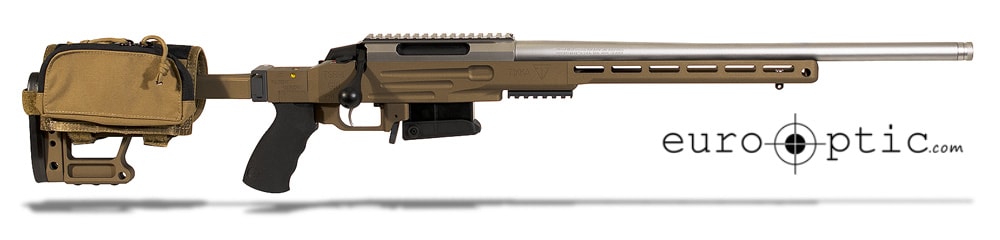 The Tikka TSR-1 Precision Rifle offers the long distance shooter a superb threaded, semi-heavy Tikka barrel and action in a class-leading aluminum chassis. With a fully adjustable folding stock with a built-in cant indicator, this MLOK-compatible rifle has a Cerakote finish in Bronze and a stainless finish on the barreled action.