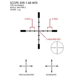 US Optic’s SVS 1-6x24 Riflescope is a CQB riflescope with an illuminated MIL Scale Reticle. The 2 MOA red dot has 10 levels of illumination including 3 low levels that are night vision compatible and has a battery life of up to 500 hours. The riflescope utilizes a rugged 34mm aluminum tube and has capped adjustment turrets with 2/10 Mil adjustments.