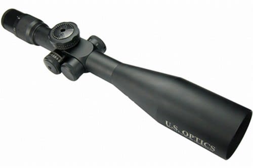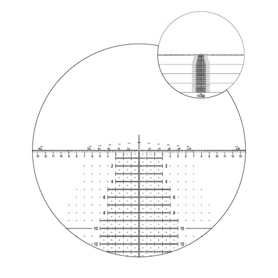This US Optics LR17 3.2-17x44 riflescope with HORUS H-59 reticle features a turret parallax left side focus, low profile rapid focus eyepiece, matte black type III hard anodizing, 12 position digital illumination, US#1 .1Mil windage knob, and a EREK .1 mil elevation knob with 110 clicks per revolution.