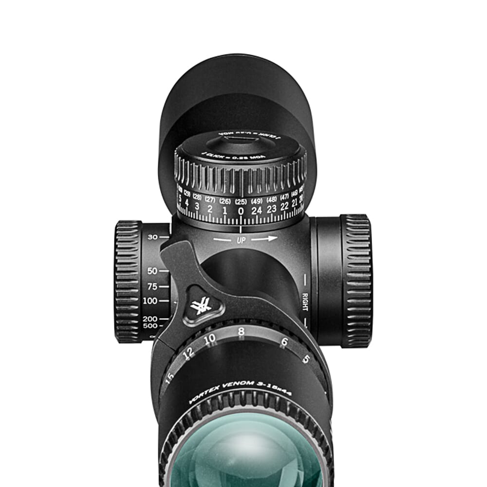 Vortex delivers a feature rich, affordable, and versatile riflescope with the Venom 3-15x44mm. It comes standard with Vortex’s renowned XD optical system with fully multi-coated lenses to enhance light transmission and reduce glare. The Venom 3-15x44mm Riflescope comes equipped with the advanced EBR-7C reticle in the first focal plane. This reticle features a precise center dot with a “Christmas Tree” pyramid of ultra-fine sub-tensions and holdover dots to compensate for bullet drop and wind drift. The Venom 3-15x44mm also features an exposed elevation turret with Vortex’s RevStop zero-stop system, allowing the shooter to return to their original zeroing after making finely tuned adjustments in the field. Additionally, the 34mm main tube provides enhanced durability and a greater range of travel.